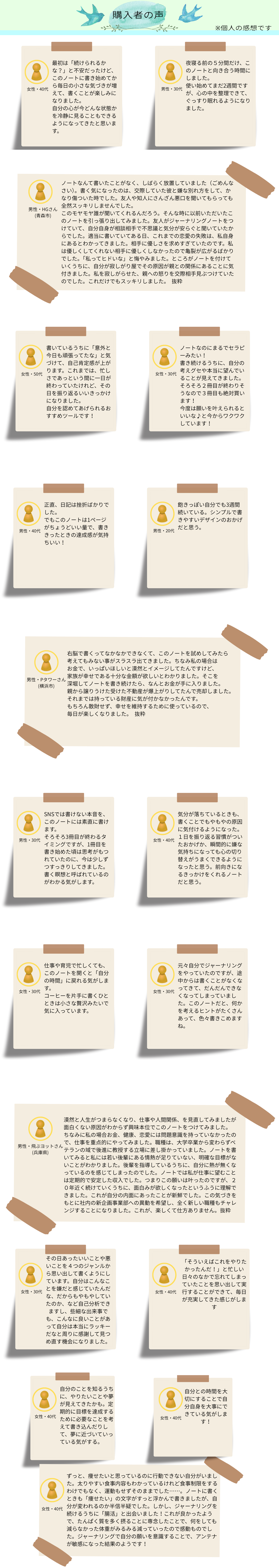 このノートを書くことで心のモヤモヤや悩みを吐き出してストレス解消につながったり、アイディアが浮かんだりと、すぐにジャーナリングの効果を感じられるでしょう。